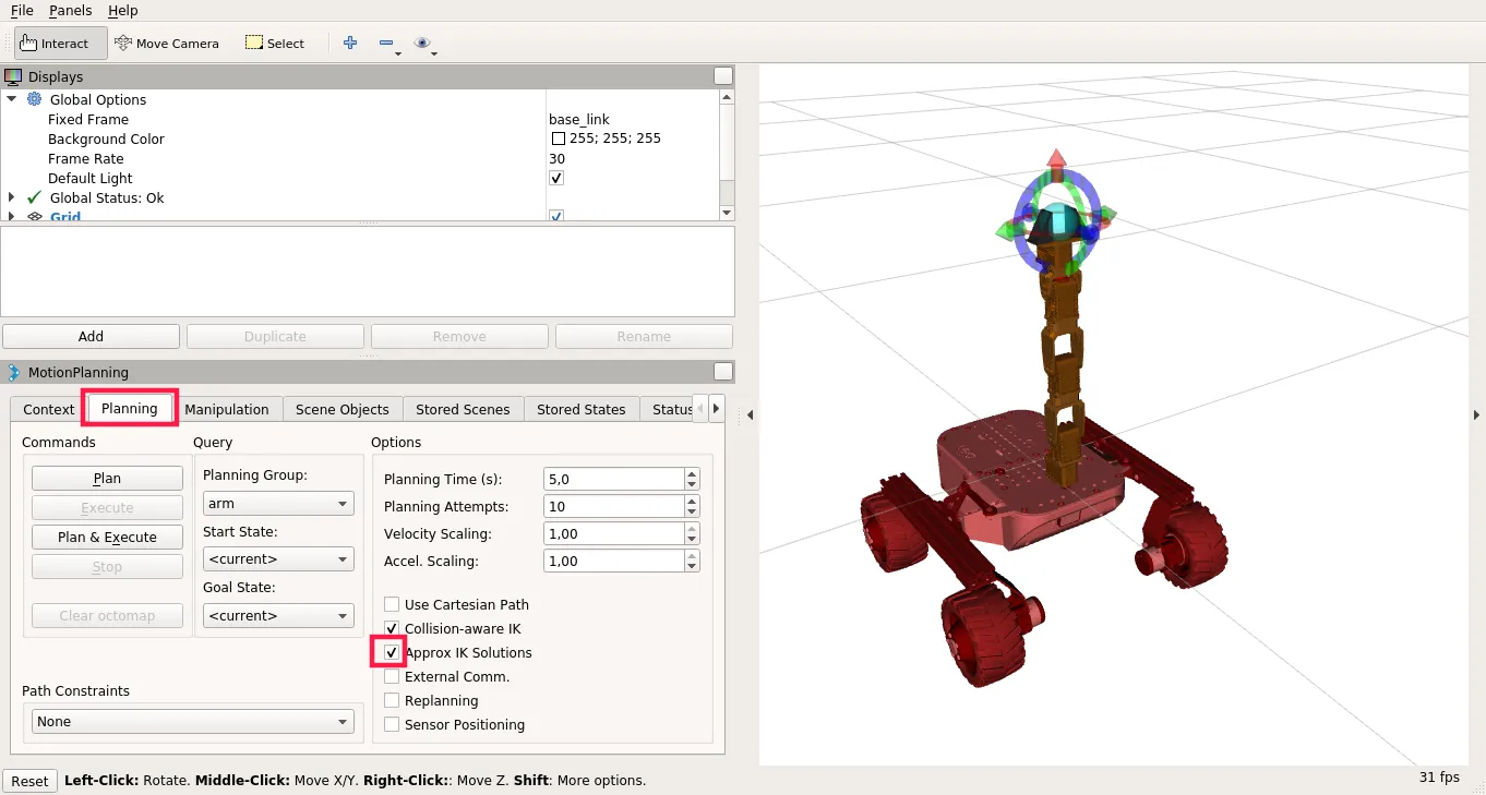 - Click on Planning tab in Motion Planning display and check Approx IK Solutions,